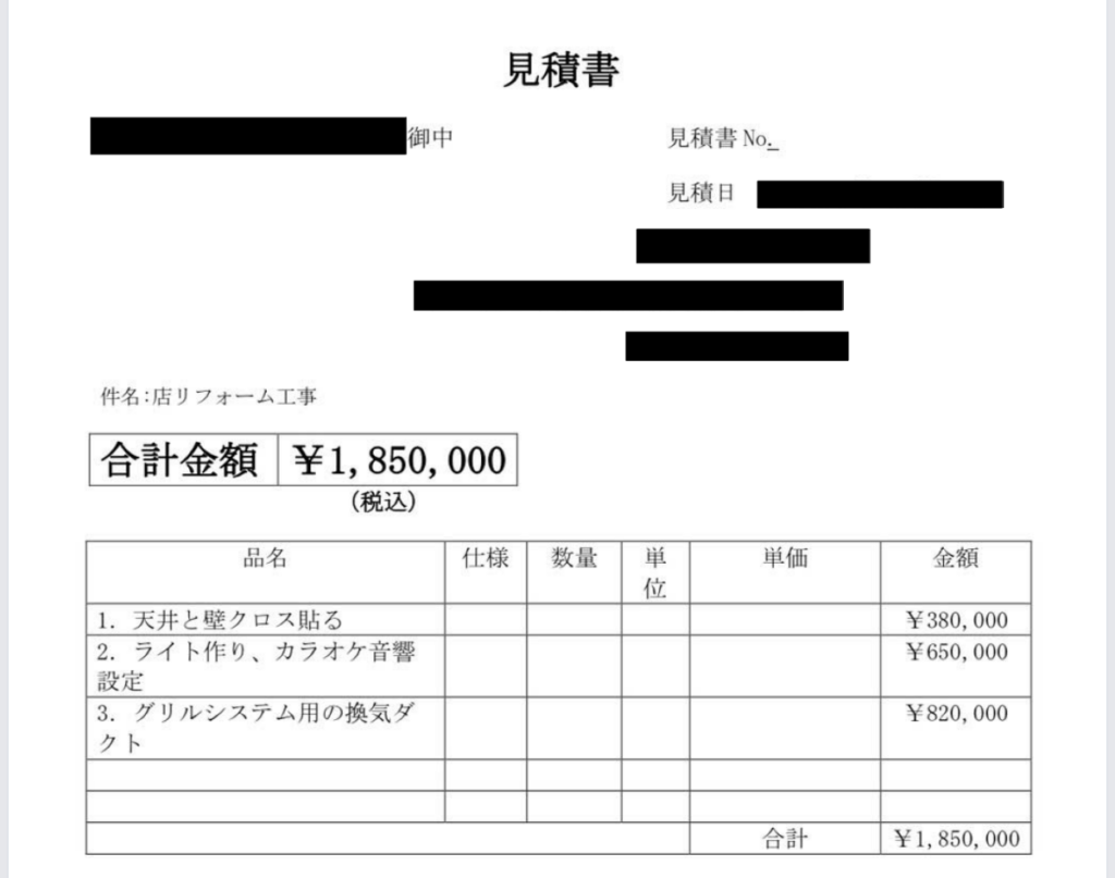 下記の見積書画像は、実際に当事務所がサポートした際に、