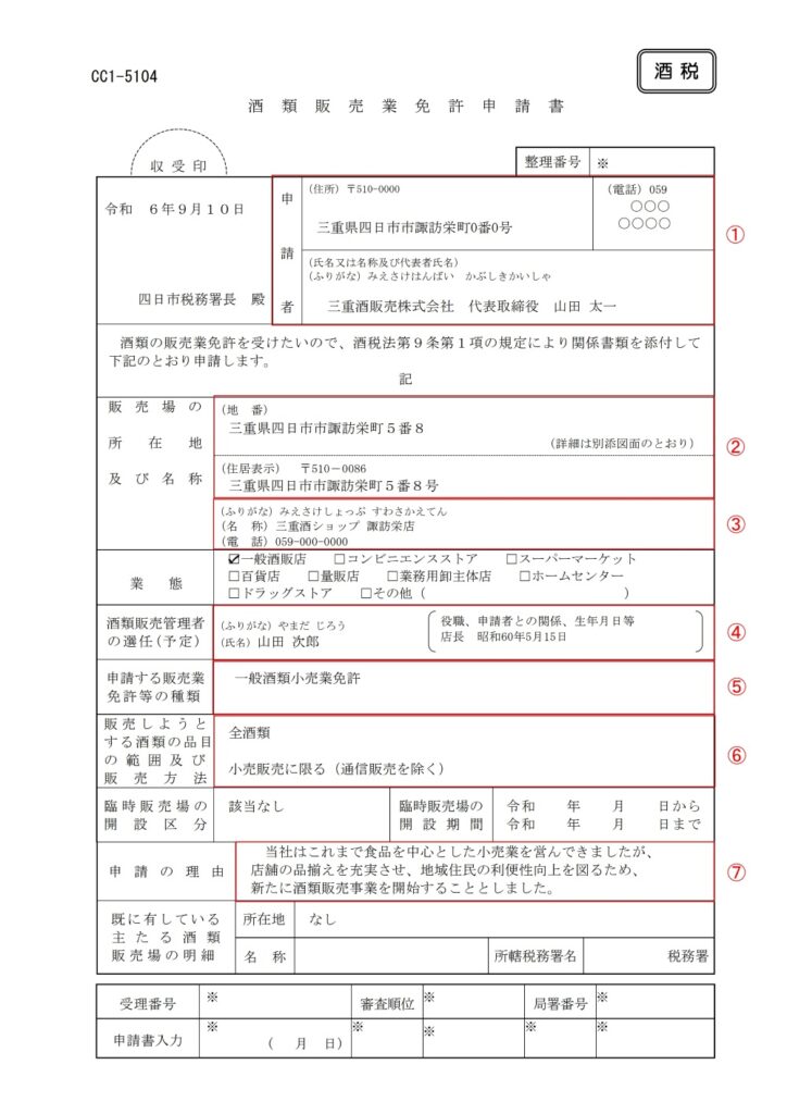 まずは、酒類販売業免許申請書の記入例を確認してみましょう。以下では、申請書の様式をもとに各項目の書き方を解説していきます。