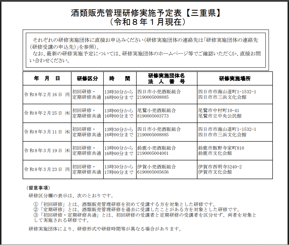 下記の表は、国税庁が公表している三重県で開催される令和8年度の酒類販売管理研修実施予定表です。