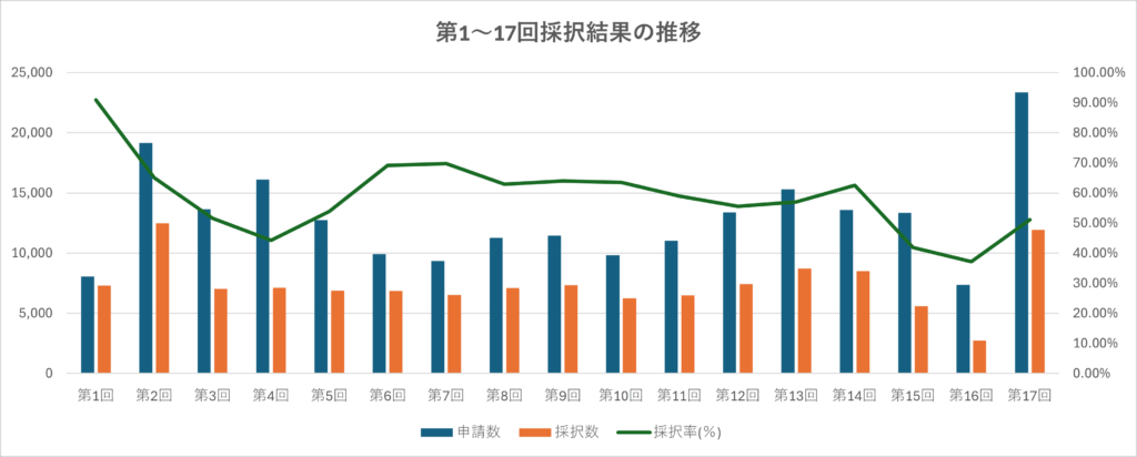 また、第17回公募(2025年5月1日申請受付開始)では申請件数が大幅に増加していますが、これは第16回公募において申請者数が比較的少なかった反動によるものと考えられます。