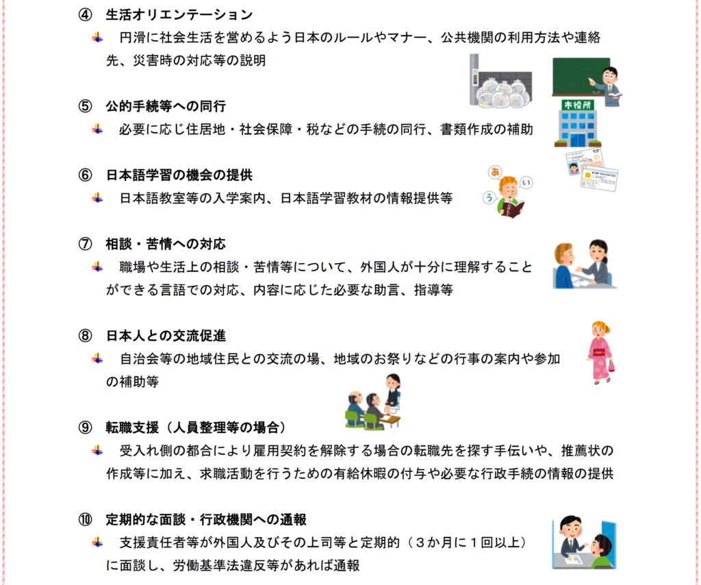 受け入れ企業は、特定技能1号外国人が安定して就労・生活できるようにするため、以下の支援を行わなければなりません。