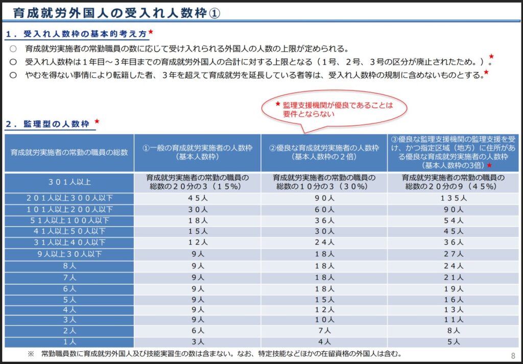 育成就労外国人の受入れ人数枠については、本記事では監理型の場合のみを前提に説明します。