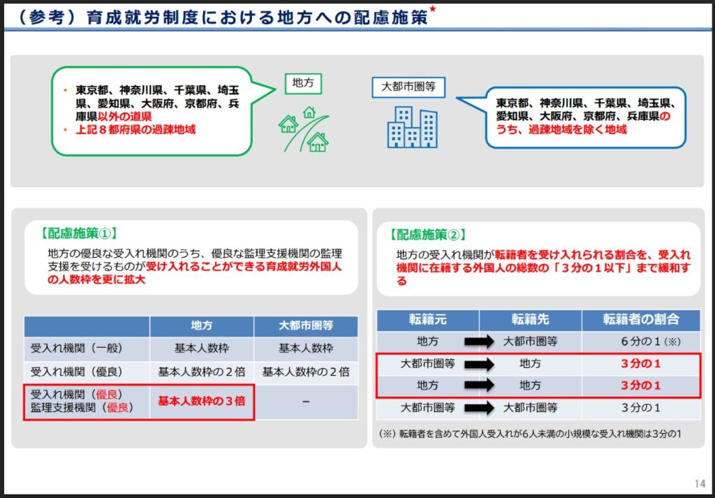 これら法務大臣・厚生労働大臣が定める指定区域では、受入れ人数や転籍者の割合について配慮措置が設けられます。