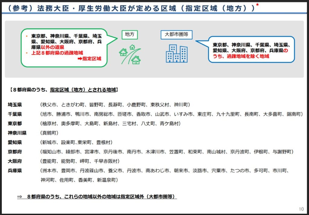 8都府県のうち、過疎地域として指定されている市町村については「指定区域(地方)」に分類され、それ以外の地域は「指定区域外(大都市圏等)」として扱われます。