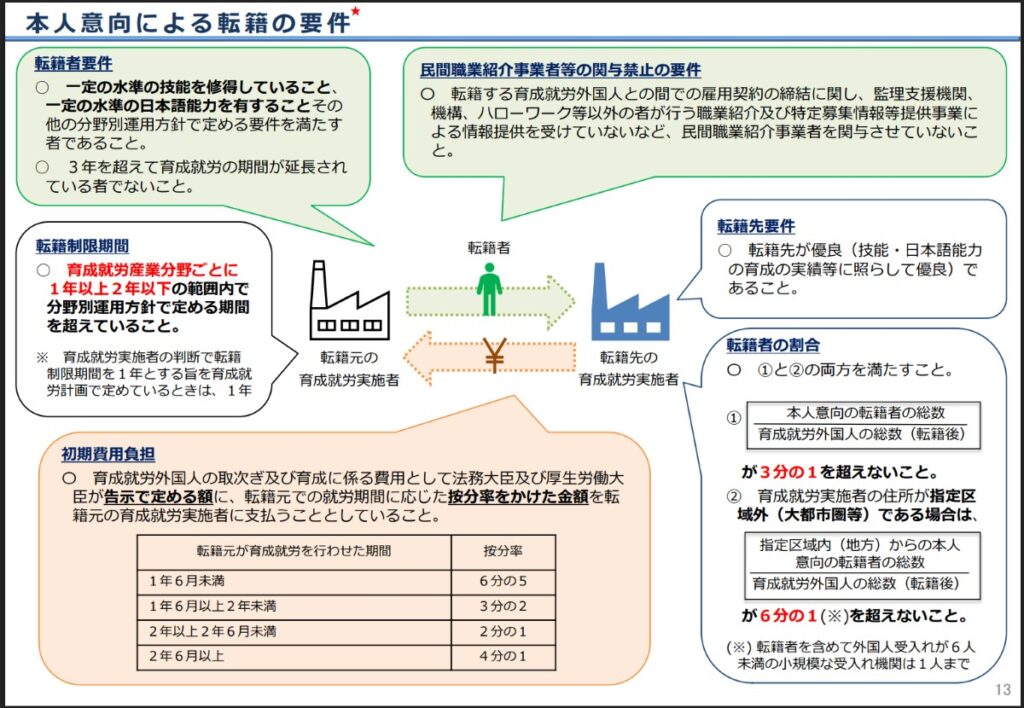 本人意思による転籍については、技能実習制度にはなかった新たな要件も設けられています。